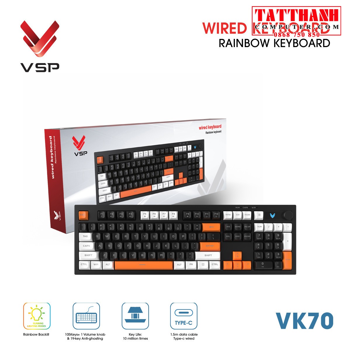 | Tên sản phẩm | Bàn phím Gaming Có Dây (Membrane) VSP VK70 |