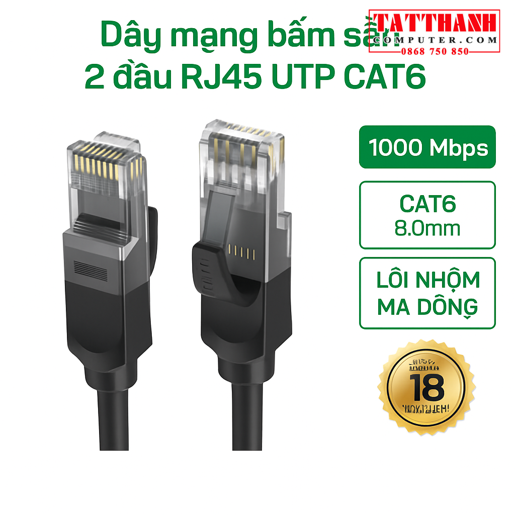 Thông số kỹ thuật: Loại cáp: UTP CAT6 Đầu nối: 2 đầu RJ45 Vật liệu: OFC (Oxygen-Free Copper) Lõi: 26AWG nhôm mạ đồng, đường kính 6.0mm Vỏ bọc: PVC thân thiện với môi trường Ứng dụng thực tế: Dùng để kết nối mạng LAN, đảm bảo tốc độ và độ tin cậy cao cho văn phòng, gia đình hoặc các thiết bị mạng khác.