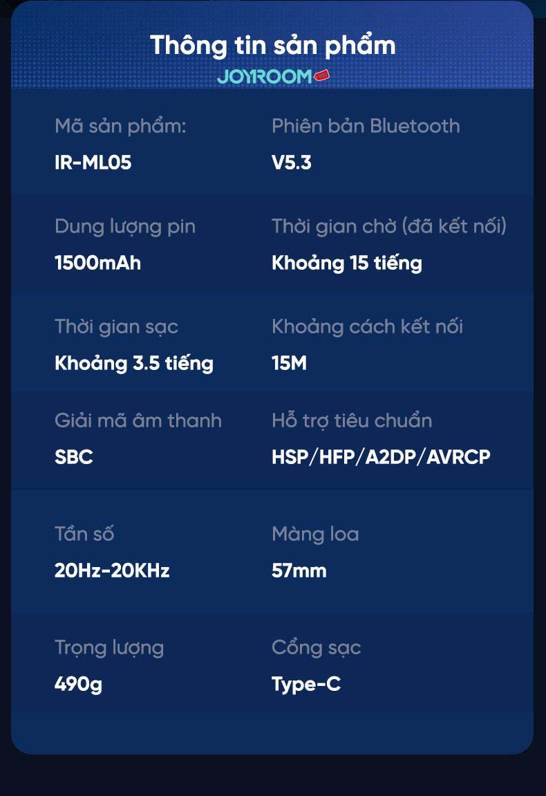 Loa bluetooth không dây Joyroom ML05 là một sản phẩm loa di động được thiết kế với kiểu dáng hiện đại và trang nhã. Sản phẩm này có tính năng đa dạng và được trang bị các công nghệ tiên tiến nhất, mang đến trải nghiệm âm thanh tuyệt vời cho người dùng.Với công nghệ Bluetooth 5.3, Loa bluetooth không dây Joyroom cho phép kết nối nhanh chóng và ổn định đến các thiết bị Bluetooth khác như điện thoại thông minh, máy tính bảng, laptop và các thiết bị khác. Ngoài ra, loa còn hỗ trợ các chế độ kết nối khác như TWS, AUX và thẻ nhớ TF, giúp người dùng dễ dàng trải nghiệm âm nhạc từ nhiều nguồn khác nhau.Joyroom ML05 còn được trang bị pin 1500mAh cho thời lượng chơi nhạc lên đến 3 giờ với âm lượng 80%, và thời gian chờ lên đến 12 giờ khi kết nối. Điều này giúp người dùng có thể sử dụng loa trong một khoảng thời gian dài mà không lo ngại vấn đề pin.Điểm nhấn của loa Joyroom ML05 là tính năng đèn RGB với 4 chế độ ánh sáng khác nhau và màu sắc tùy chọn, giúp tạo ra không gian thưởng thức âm nhạc độc đáo và ấn tượng. Ngoài ra, loa còn được trang bị mic tích hợp cho phép người dùng thực hiện cuộc gọi thoại một cách dễ dàng và rõ ràng.Sản phẩm được trang bị loa đường kính 57mm và công suất 8W, giúp tạo ra âm thanh chi tiết và chất lượng cao. Tần số đáp ứng của loa từ 20Hz đến 20KHz, giúp phát lại âm thanh đầy đủ và trung thực.Joyroom ML05 là một sản phẩm loa Bluetooth di động rất tuyệt vời cho những người yêu thích âm nhạc và đang tìm kiếm một sản phẩm có thiết kế đẹp mắt, tính năng đa dạng và chất lượng âm thanh tốt.TÍNH NĂNG SẢN PHẨM